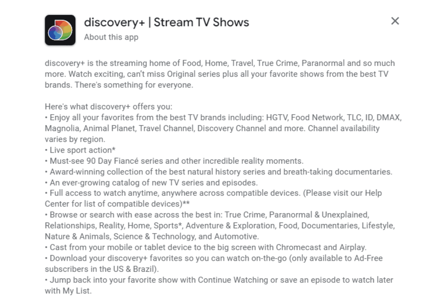 discovery+ already has a solid and compelling title. Take note that the Google Play Store allows us to use up to 30 characters for the title. As of now, discovery+ is using 28, and that’s good.