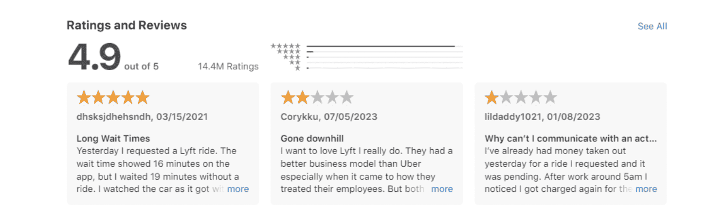 Looking at the ratings, we can see a lot of things to improve here. Take note that Lyft, at the time of this writing, has an average rating of 4.9 stars from more than 14.4M users.