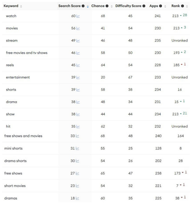 Looking at the search scores of the keywords included in the title, the search score of “watch” is 60, “dramas” is 18, and “show” is 38. As you can see, all of the keywords have high search scores, and we can conclude that ShortMax has a quite strong title. However, there is a great opportunity for improvement.